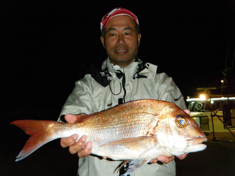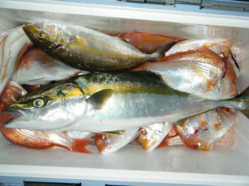 愛知県稲沢市の宮澤さん他 タイ(25〜38cm)良い人12匹 ワラサ(65〜68cm)船中3匹 ハマチ(45〜50cm)0〜5匹 カンパチ(50cm)1匹 風が強く吹き船酔いする人もいましたが、最後まで頑張り楽しんでいただけた様です。 |